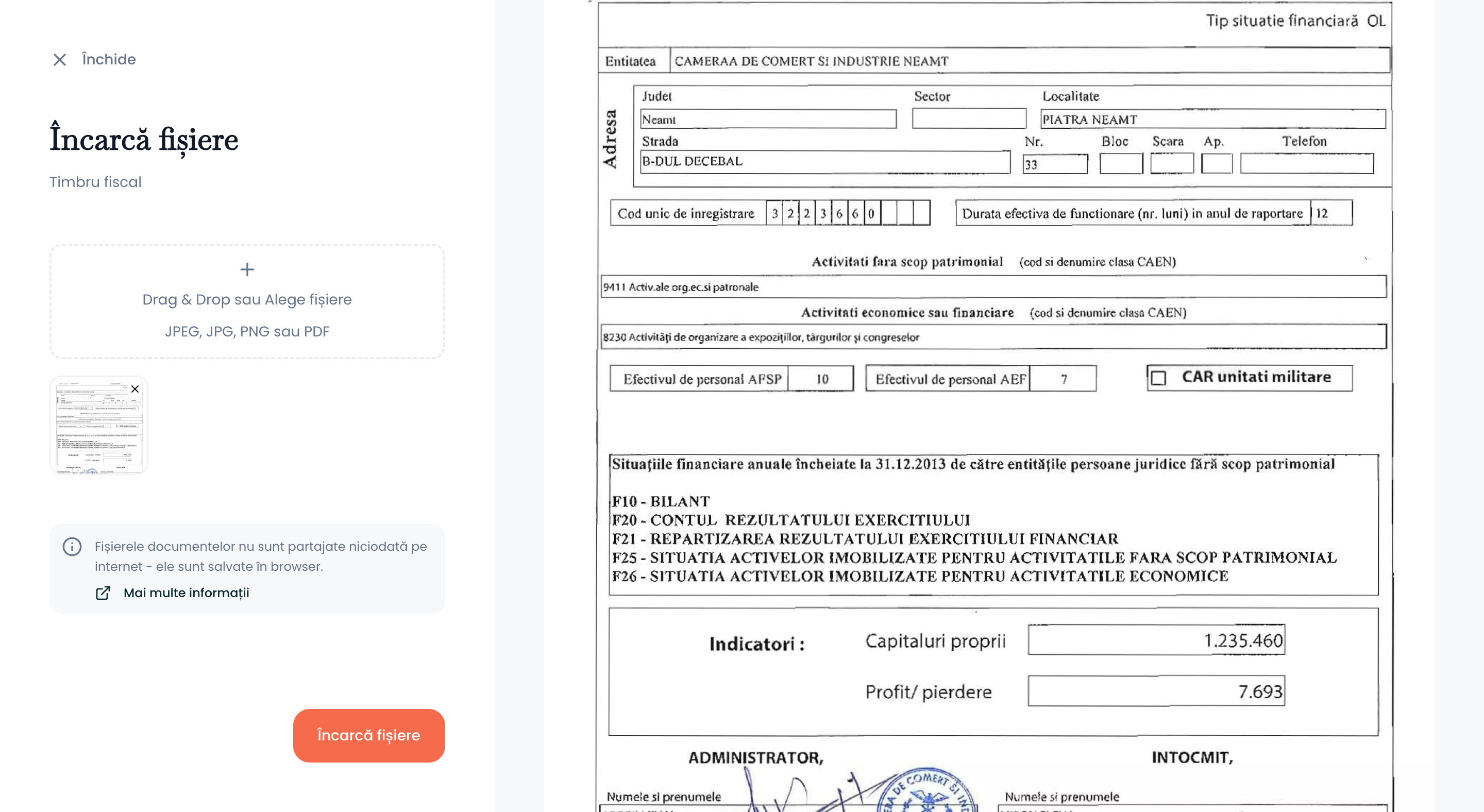 Toate datele și documentele încărcate în platforma sunt stocate în browserul tău.